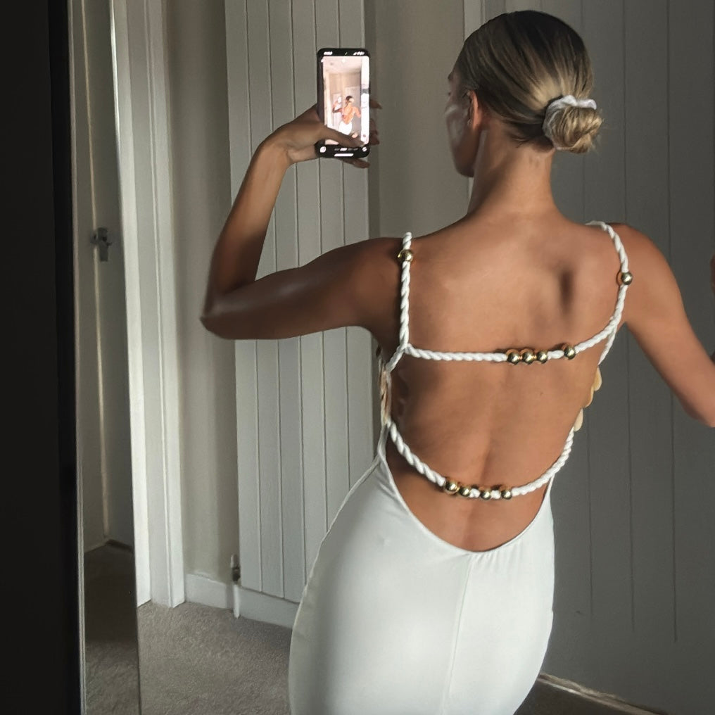 Backless maxi dress with shell embellishment