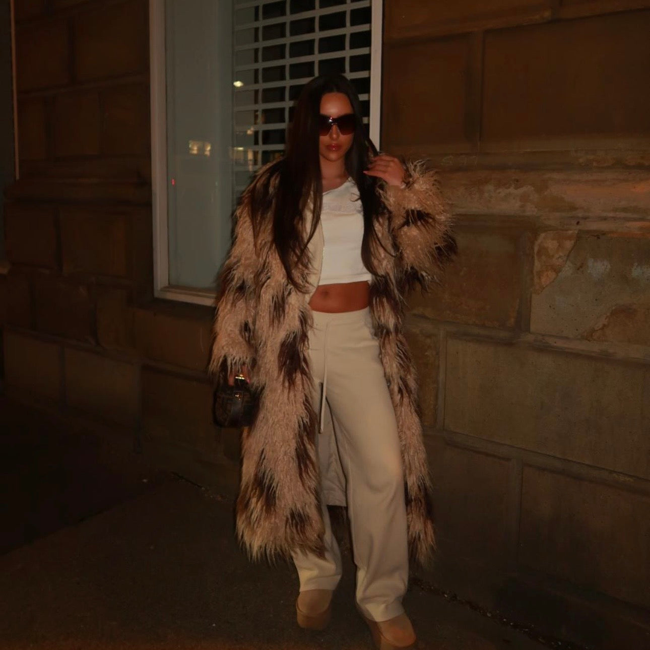 Cream shaggy faux fur coat with brown spots