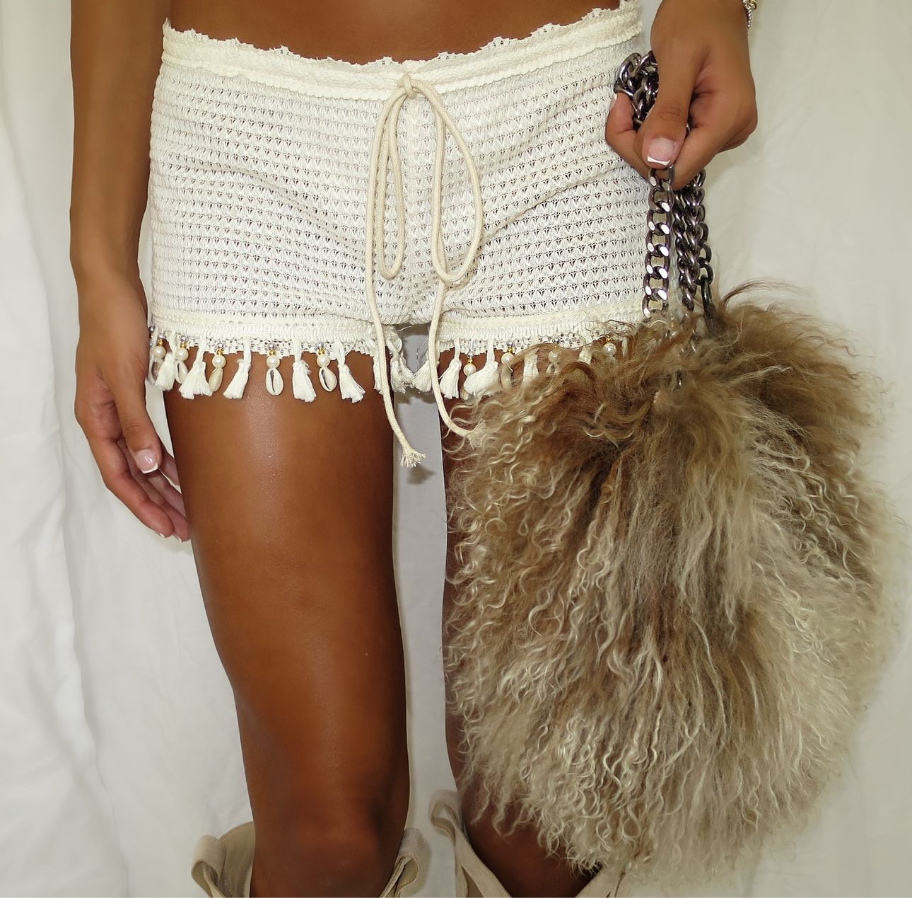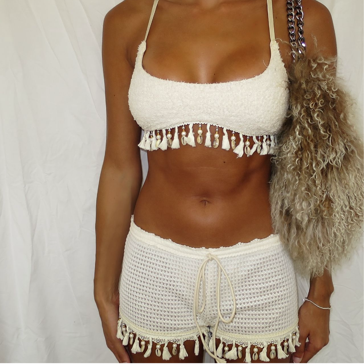 Cream boucle crop top and knit mini shorts with tassel embellishment